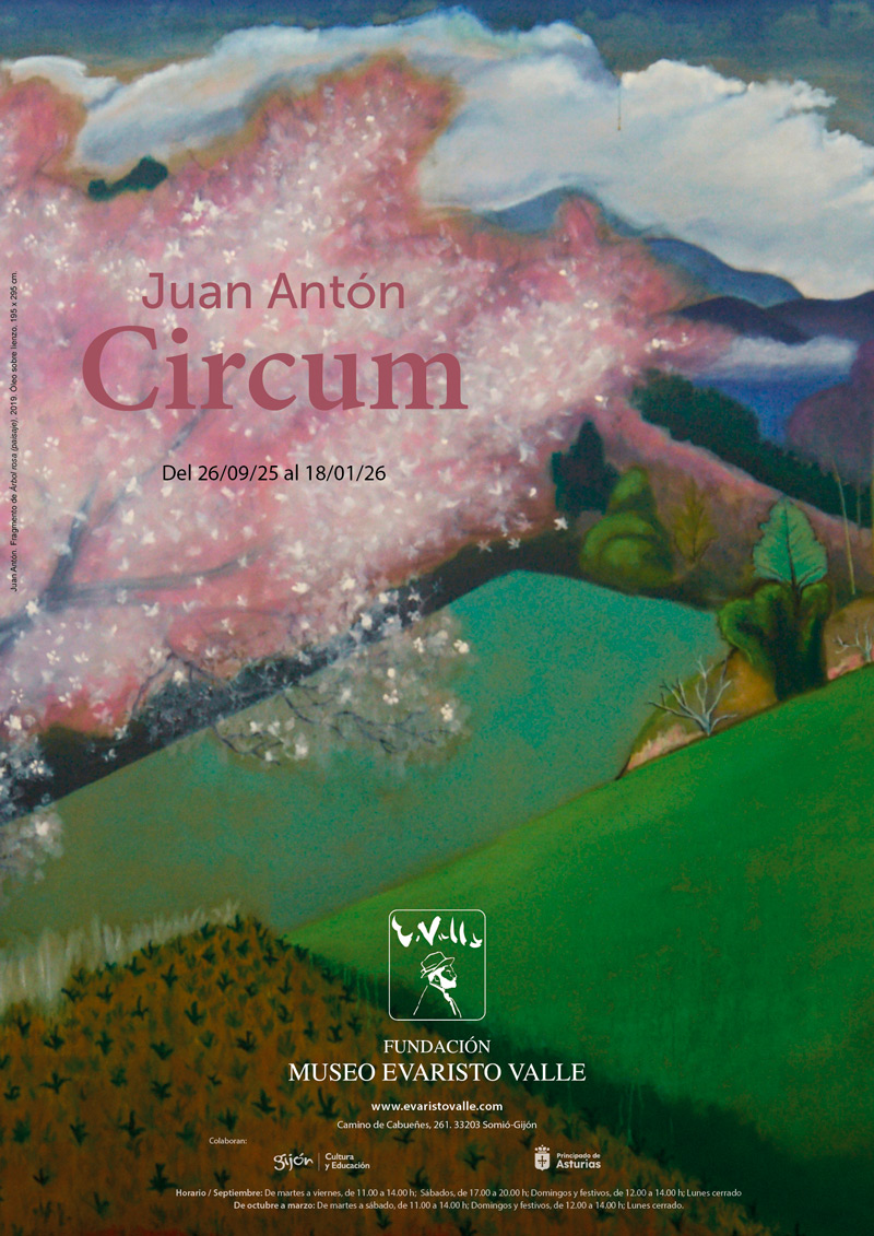 La muestra presenta 15 obras fruto de la producción más reciente de Juan Antón (Cué, Llanes, 1976), en la que predominan los grandes formatos, protagonizados por el paisaje que circunda su estudio en Cué, pues circum, de alrededor, alrededor de, entorno, lo que rodea… alude para el autor desde lo más literal a lo irónico, o a algo mas profundo como la idea de que lo que rodea, el paisaje, la orografía, marca el carácter.